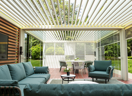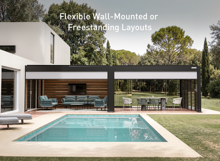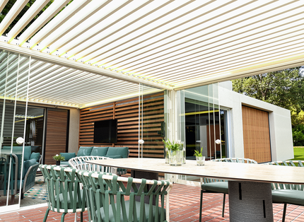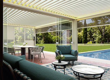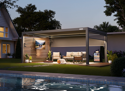 Upgrade your outdoor entertaining with the 13' x 20' POWER+ PRO Pergola. With sliding glass doors, motorized shades, and privacy shutter walls, it creates a stylish backyard bar that’s comfortable in any season.